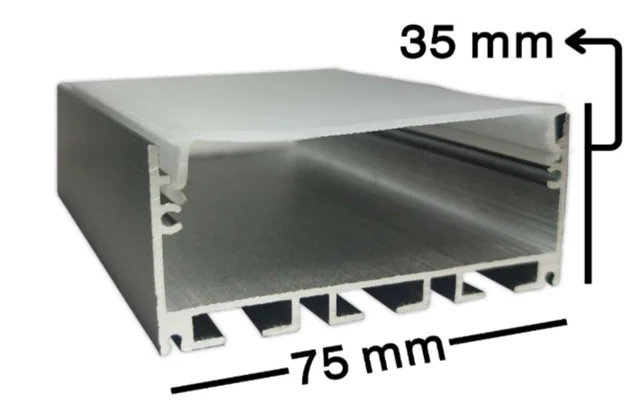 -جنس پروفیل:جنس این پروفیل از آلومینیوم میباشد ۲-کاربرد:کاربرد این محصول برای نصب روکار و آویز مورد استفاده قرار میگیرد 3-نوع عرضه:عرضه این محصول به صورت شاخه های سه متری میباشدمتر درج شده برای یک شاخه سه متری از این پروفیل میباشد 4-سایز و ابعاد :ارتفاع 35mmعرض کار 75mm